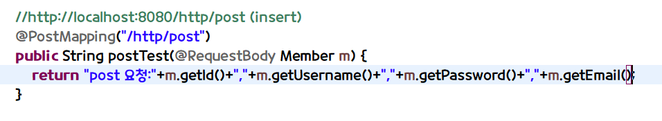 ์ด๋ ๋ฏธ๋ฆฌ ๋ง๋ค์ด๋์ member ํด๋์ค๋ฅผ ํ์ฉํ์ฌ HTTP ์์ฒญ์ ํ์ธํด๋ณผ ์ ์๋ค. ๋จผ์ ์๋์ ๊ฐ์ด getTest ๋ฉ์๋๋ฅผ ์์ ํ postman์์ get ์์ฒญ์ ํด๋ณด๋ฉด