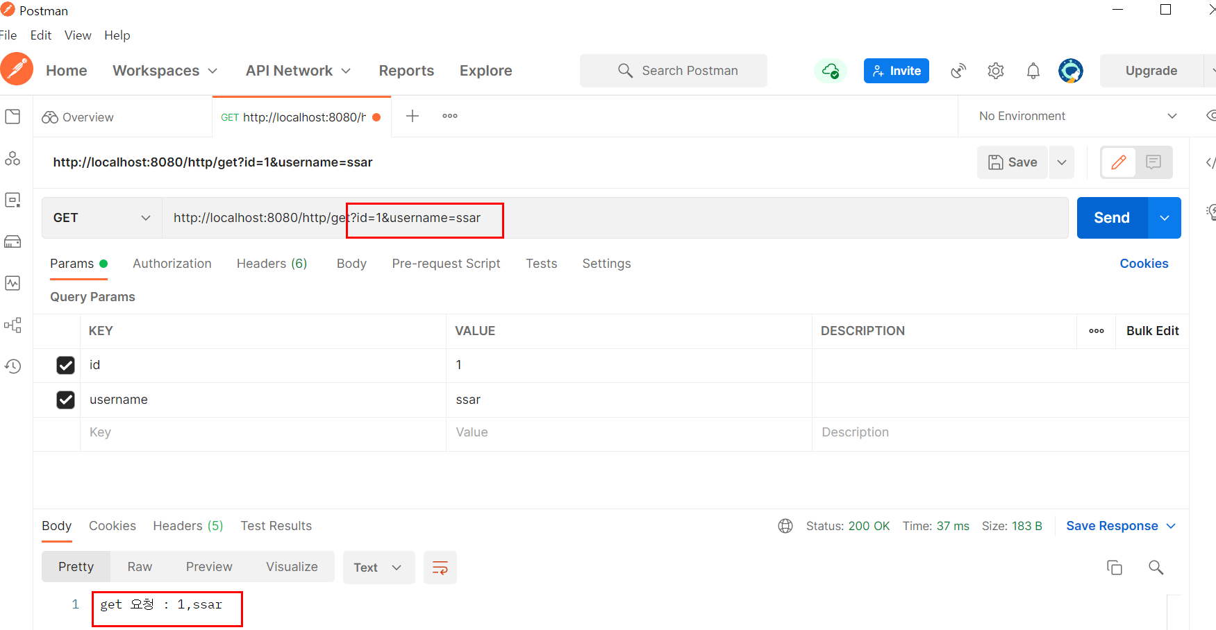 ์ด๋ ๊ฒ id ๊ฐ์ด ํจ๊ป ๋์จ๋ค. ์ด๋ http/get?id=1 ์ด ๋ถ๋ถ์ ์ฟผ๋ฆฌ์คํธ๋ง์ด๋ผ๊ณ ํ๋ค.