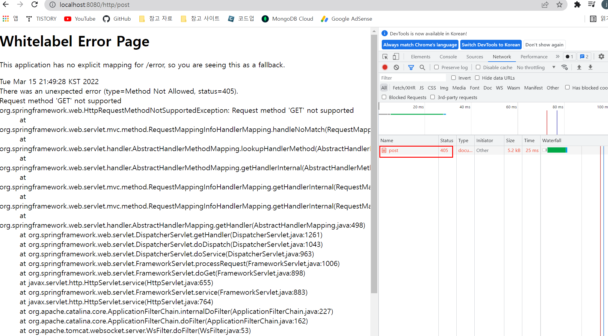 Post๋งคํํด๋ ์ฃผ์ ์ ๋ ฅ ์์๋ ์๋ฌ๊ฐ ๋๋ค. -> ์ธํฐ๋ท ๋ธ๋ผ์ฐ์ ์์ฒญ์ ๋ฌด์กฐ๊ฑด get ์์ฒญ๋ฐ์ ํ ์ ์๋ค.