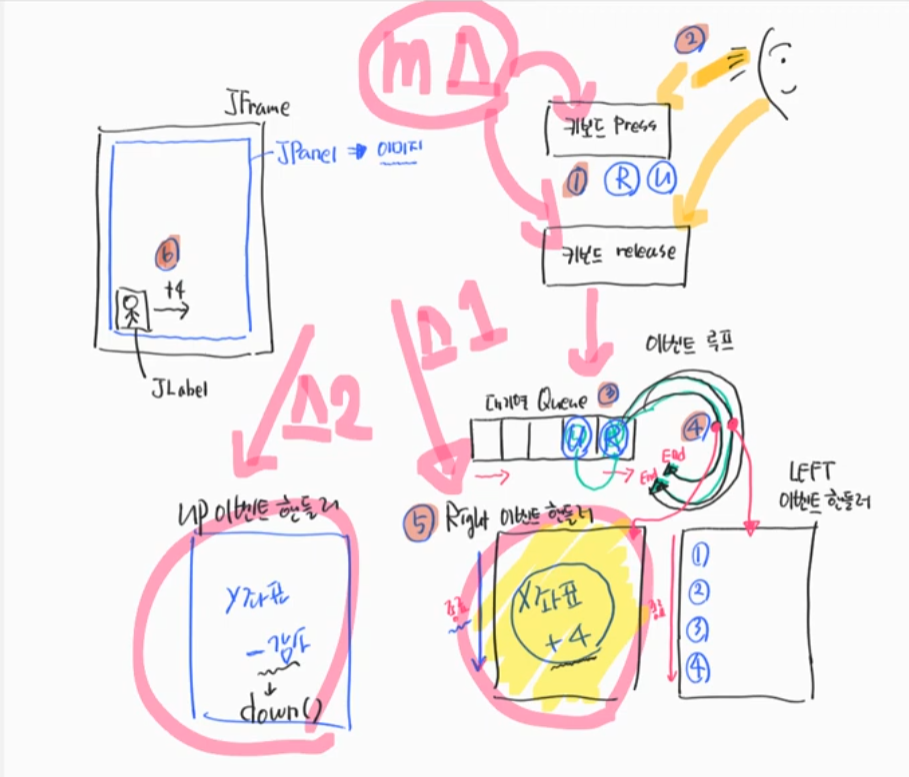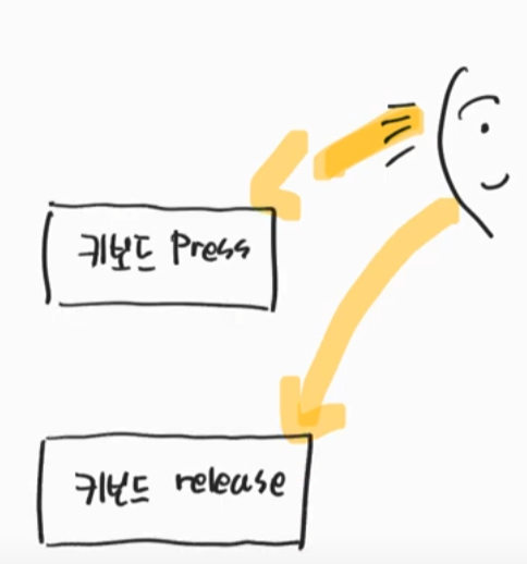 키보드 프레스가 눌러지면 리스너가 감지 대기열 Que에 들어간다 -> 대기항목이 이벤트 루프에 들어가면 핸들러가 동작