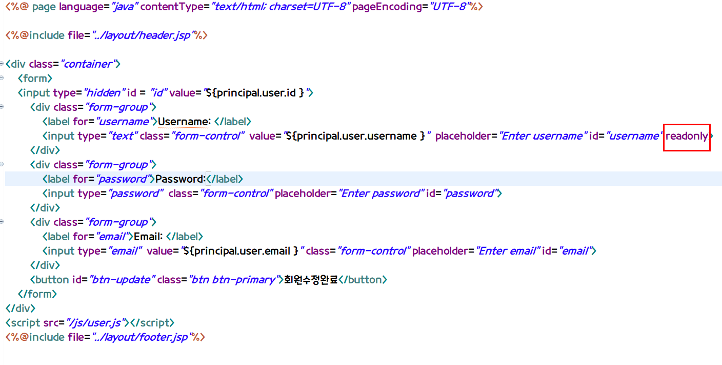 - username์ ์์ ํ ์ ์๋๋ก readonly๋ฅผ ๋ฃ์ด์ค๋ค.