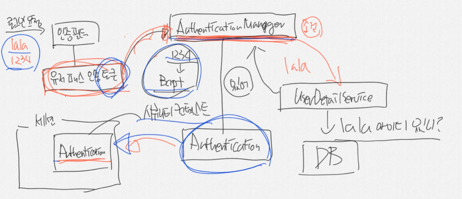 - AuthenticationManager๊ฐ ๊ทธ๋ฅ username,password๊ฐ ์๋ ํ ํฐ์ ๋ฐ์์ ๊ฐ์ฒด๋ฅผ ๋ง๋ฆ.