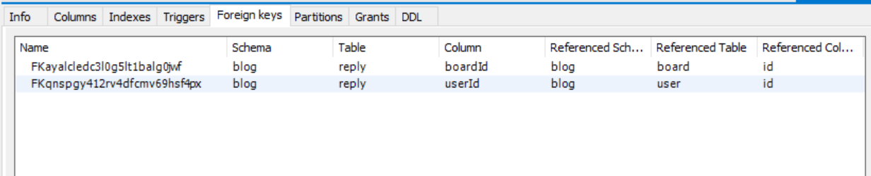 - 이렇게 어노테이션을 선언해 주면 아래와 같이 자동으로 board, user 테이블을 참조하는 것을 확인할 수 있다.
