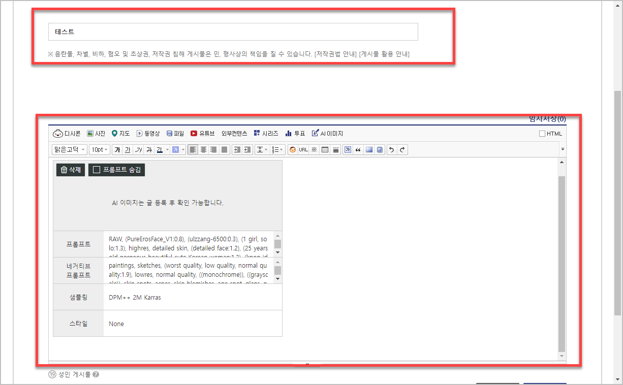 프롬프트와 샘플링, 스타일 등을 입력하고 등록을 누르게 되면 글 양식을 만들어 줍니다.