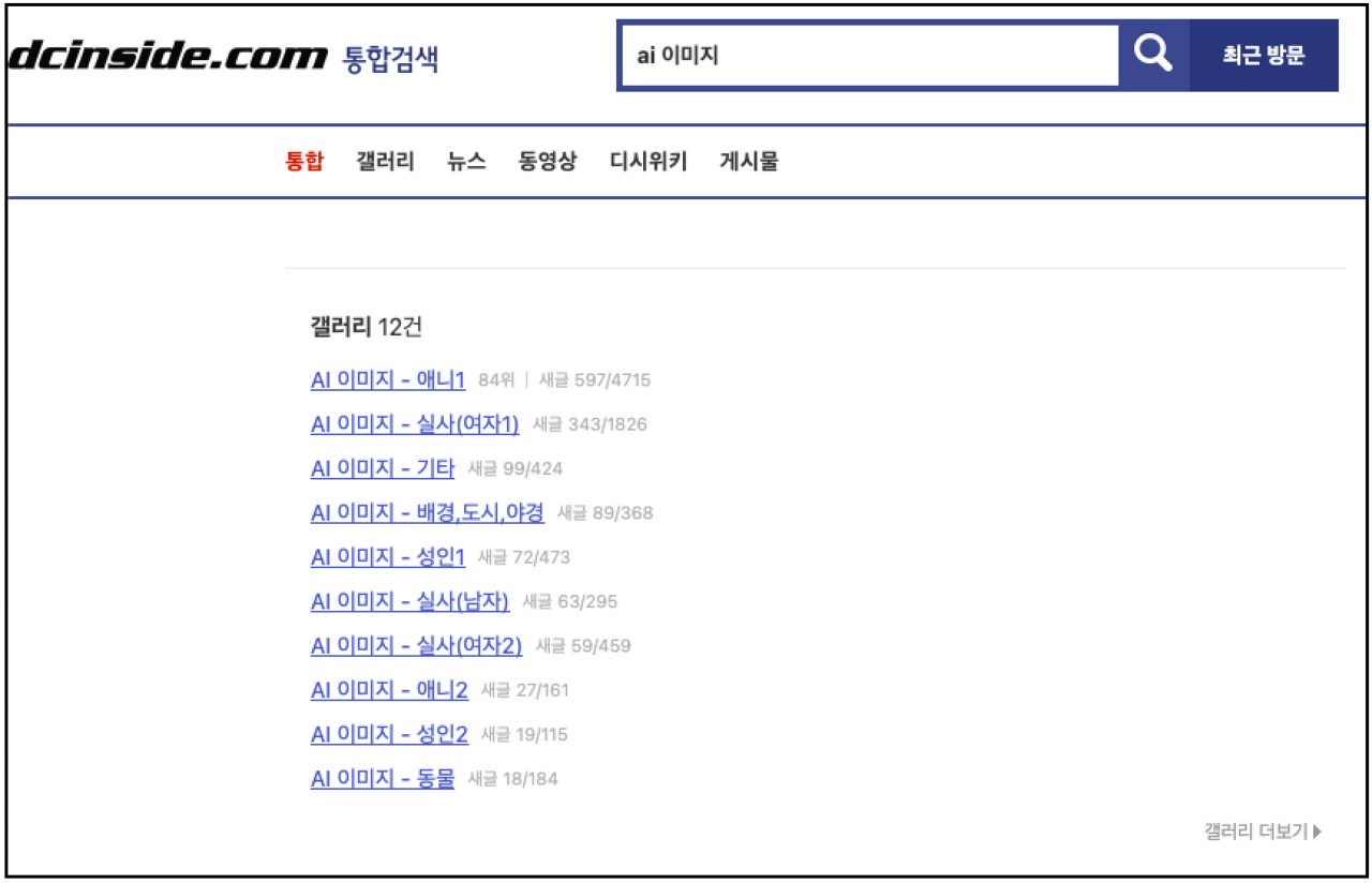 먼저 디시인사이드에서 ai 이미지 갤러리를 검색해서 들어가 줍니다. 애니, 실사, 배경, 도시, 야경, 성인, 동물 등 여러 카테고리가 있습니다. 성인은 물론 성인 인증이 필요한 공간입니다.