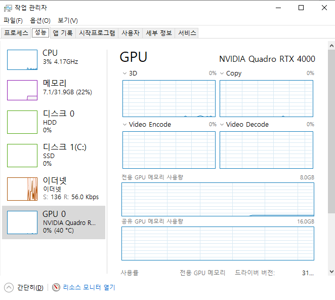 성능 탭에서 자신의 사양을 확인할 수 있습니다.