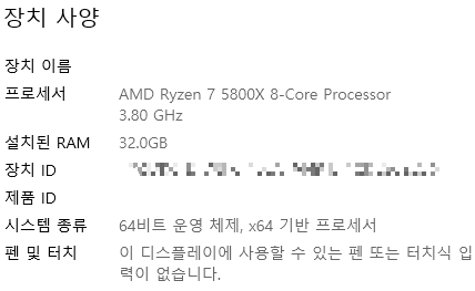 장치 사양 항목의 (설치된 RAM)을 보면 몇 GB가 설치되어 있는지 알 수 있습니다.